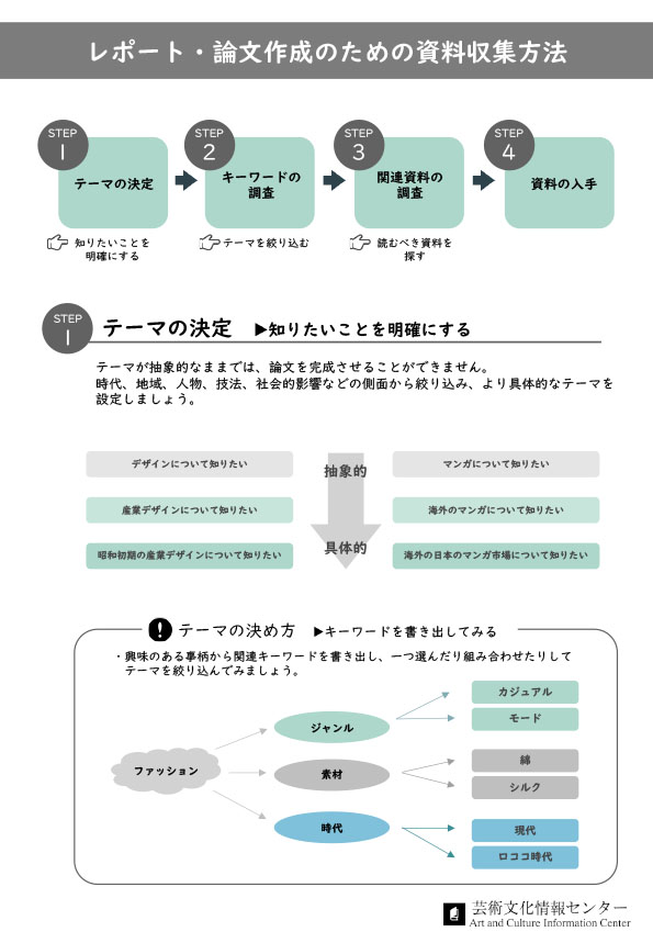 レポート・論文作成のための資料収集方法 いきなりレポート・論文を書き出して、苦労したことはありませんか? 作成の前には資料収集が欠かせません。 このテキストを読み、資料収集に役立ててください。 レポート・論文作成のための資料収集方法 [PDF] 一覧へ戻る 最近の記事 2026年3月28日 情報の探し方 レポート・論文作成のための資料収集方法 2026年3月28日 情報の探し方 データベースの使い方「ジャパンナレッジ」 2026年3月28日 情報の探し方 データベースの使い方「CiNii Research」